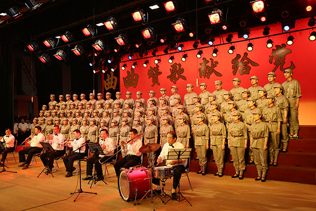 最后,集團(tuán)公司工會(huì)副主席賈志成上臺(tái)指揮,臺(tái)上隊(duì)員和臺(tái)下2000多名觀眾全體起立,共同唱響《沒有共產(chǎn)黨就沒有新中國》,現(xiàn)場紅旗舞動(dòng),歌聲洪亮,將整臺(tái)演出活動(dòng)推向了高潮。
