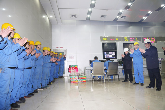 1月26日,縣長(zhǎng)郅書安帶領(lǐng)四大班子領(lǐng)導(dǎo)到發(fā)電公司慰問(wèn)一線員工,公司董事長(zhǎng)李躍民、總經(jīng)理郭峰等陪同。