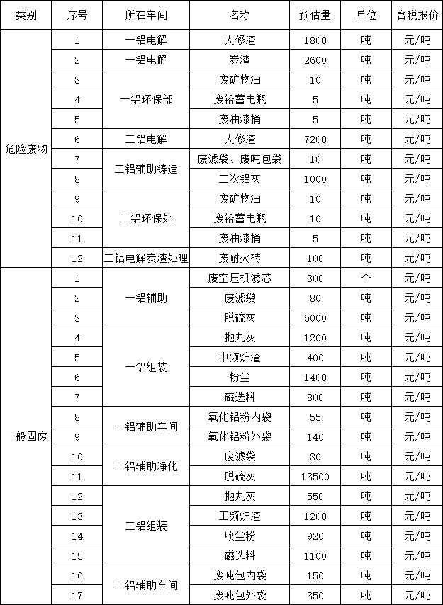 萬(wàn)基控股集團(tuán)招標(biāo)辦近期將對(duì)河南萬(wàn)基鋁業(yè)股份有限公司的危廢(十二項(xiàng));大修渣、二次鋁灰、炭渣等;一般固廢(十七項(xiàng));噸包袋、中頻爐渣、磁選料等物料進(jìn)行銷售招標(biāo)(下附清單),業(yè)主單位不對(duì)該物資的質(zhì)量、用途等做任何承諾,以現(xiàn)場(chǎng)標(biāo)的物現(xiàn)狀為準(zhǔn)。歡迎參與前期實(shí)物勘查。